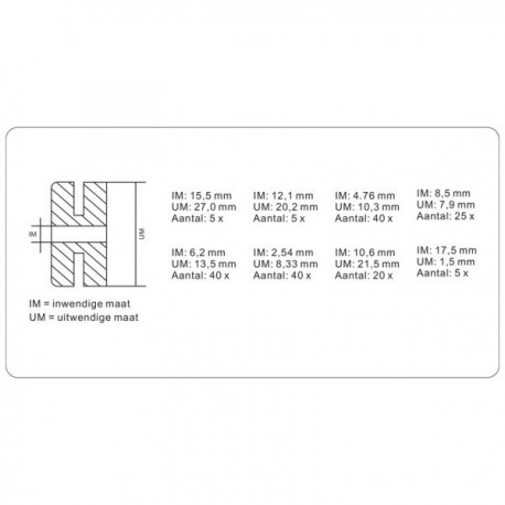 Inhoud qua maten (inwendige maat x uitwendige maat):