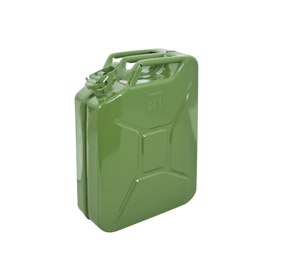 Stevige solide groene metalen benzinekan met lekvrije beugelsluiting voor het veilig opslaan en vervoeren van loodvrije brandstof en ethanol E85 (Bio-Ethanol).
