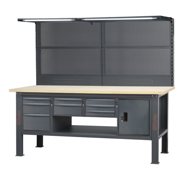 Belangrijkste kenmerken: • Werkblad (2100x750 mm) van multiplex, 38 mm dik • 8 laden (367x588 mm) met kogelgelagerde geleiders: 5 laden van 70 mm hoog 2 laden van 140 mm hoog 1 lade van 210 mm hoog • Ladebodems beschermd door schuimrubbermatten • Elke lade biedt plaats aan maximaal 4 trays van EVA-schuim of gethermoformeerd ABS • Centrale vergrendeling aan de voorzijde • 1 module met deur en slot • Stalen frame met 4 steunpoten • Gaten voor een bankschroef (1599F/150 - 1599GI/150, apart te bestellen) • 2 onderste halve planken voor opslag, 1788x335 mm, 40 mm dik • Statisch draagvermogen: 800 kg, gelijkmatig verdeeld • Kan aan de vloer worden bevestigd