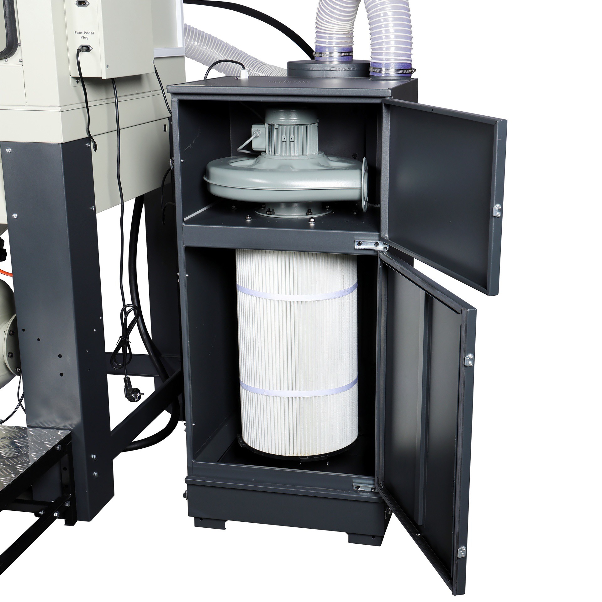 Uitgevoerd met een cabine inhoud van 990 liter en een grote voorklep voor toegang tot de werkruimte. De standaard 2 traps stofafzuiging bestaat uit een cycloon (prefilter) en een cartridge hoofdfilter (micron). Zwaardere deeltjes worden eerst door de cycloon afgescheiden, waarna het cartridgefilter fijnstof opvangt tot circa 8 µm. Dit helpt om goed zicht in de straalcabine te houden en beperkt verstopping en verlies van straalmiddel.